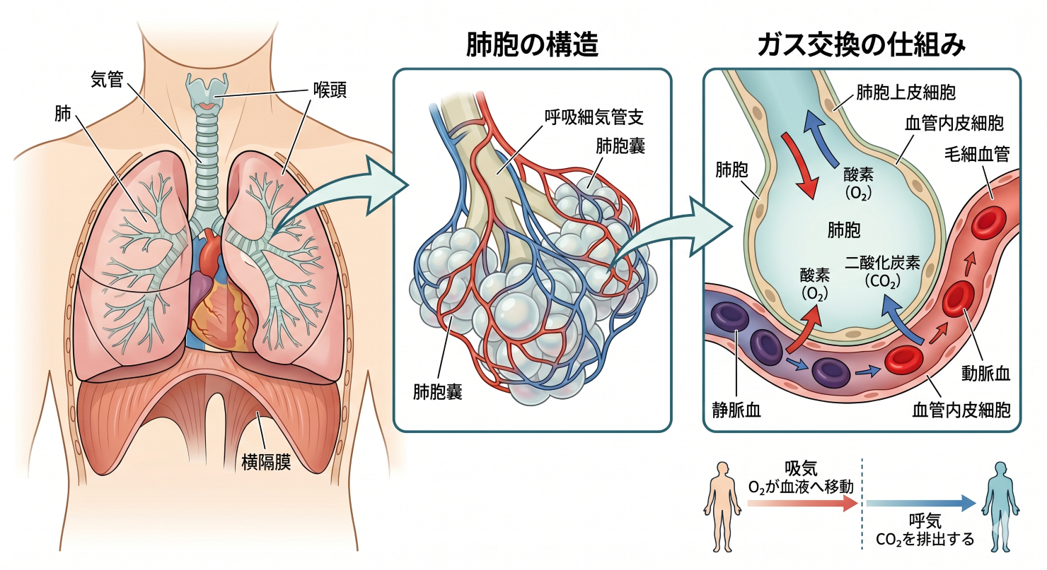 ため息には、自律神経以外にも非常に重要な物理的役割があります。それは、私たちの肺を構成する小さな空気の袋、「肺胞(はいほう)」の健康を守ることです。肺の中には、ブドウの房のような形をした肺胞が数億個も存在しており、ここで酸素と二酸化炭素の交換が行われています。