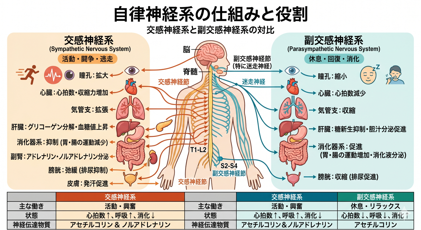 ため息の最大のメリットは、乱れた「自律神経」を瞬時に整えてくれる点にあります。自律神経には、活動モードの「交感神経」と、リラックスモードの「副交感神経」の二つがあります。私たちは強いストレスを感じると、無意識のうちに交感神経が過剰に働き、呼吸が浅く、速くなってしまいます。