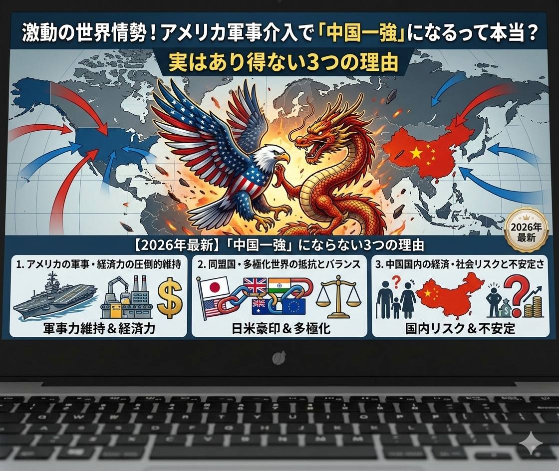 特に衝撃的だったのは、2026年初頭にアメリカとイスラエルが主導した、ベネズエラやイランに対する直接的な軍事介入です。長年のライバルだった国の指導部が短期間で排除されたことで、「アメリカはやりすぎて孤立し、漁夫の利を得た中国が世界を支配する『中国一強』の時代が来るのでは?」と予想する声も聞こえてきます。