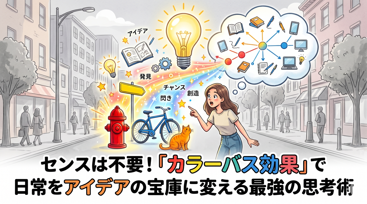 この記事を読むことで、特別な才能がなくても、通勤中や散歩中の数分間で「売れるヒント」や「面白い企画」を見つけ出せるようになります。あなたの脳を「アイデア獲得モード」に切り替える魔法の法則、カラーバス効果の世界をのぞいてみましょう。