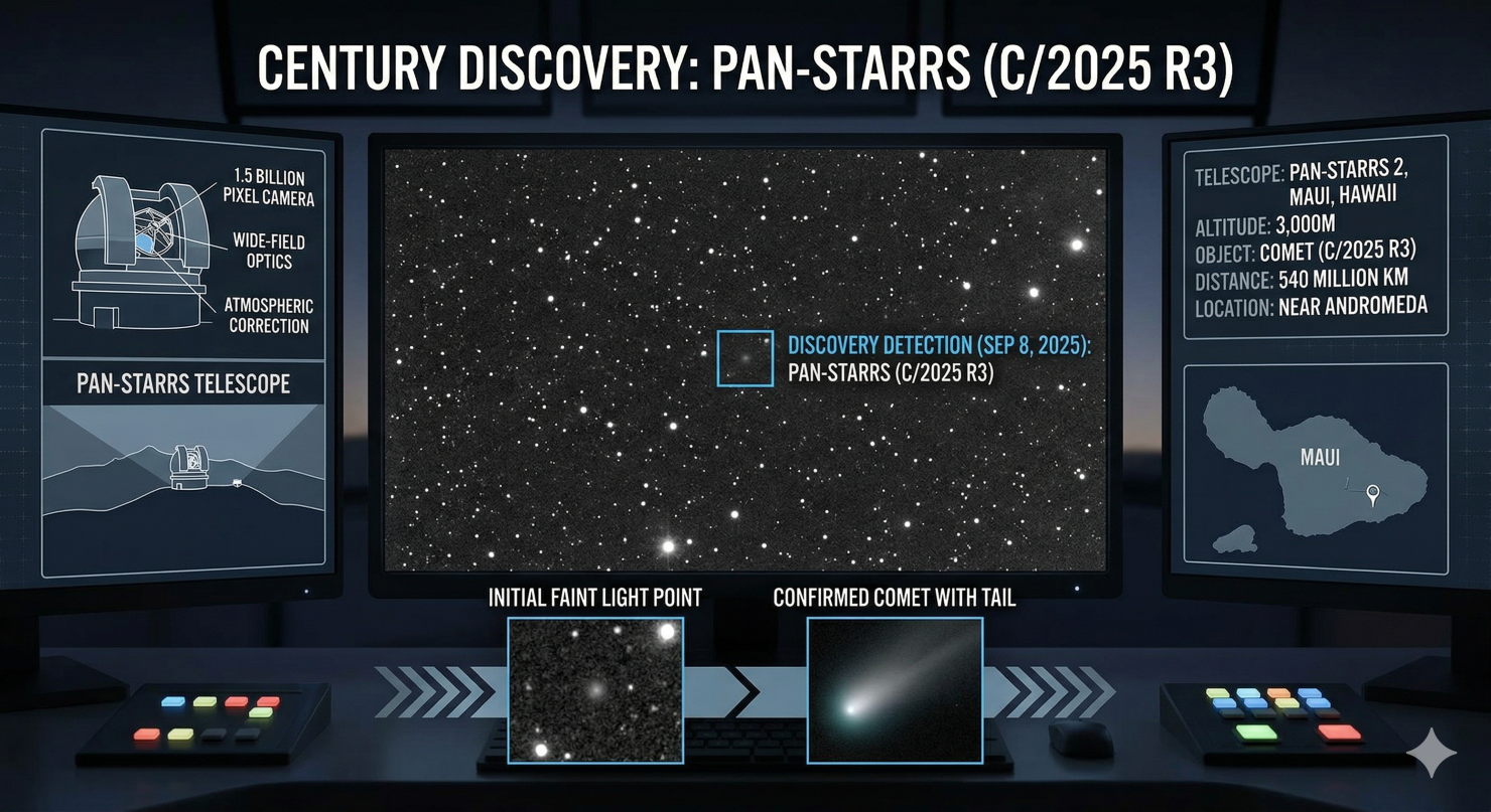 発見されたとき、この彗星はアンドロメダ座のあたりにいて、太陽からは約5.4億キロメートルも離れていました。その時の明るさは、肉眼で見える限界の明るさよりも数百万倍も暗い状態でした。最初はただのぼんやりとした光の点に見えましたが、その後の精密な観測によって、彗星特有の「尾」があることが確認され、正式に「パンスターズ彗星(C/2025 R3)」と名付けられました。これ以降、世界中の天文学者がこの彗星の動向に注目し始めたのです。