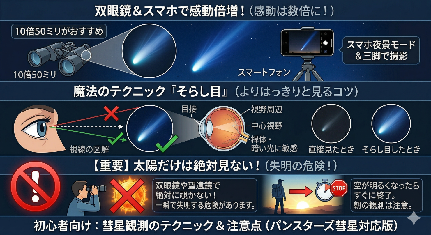 彗星は太陽の近くにいるため、観測中に太陽が昇ってくることがあります。双眼鏡や望遠鏡で太陽を絶対に覗かないでください。一瞬で目を痛め、失明する危険があります。空が明るくなってきたら、すぐに観測を終了するようにしましょう。