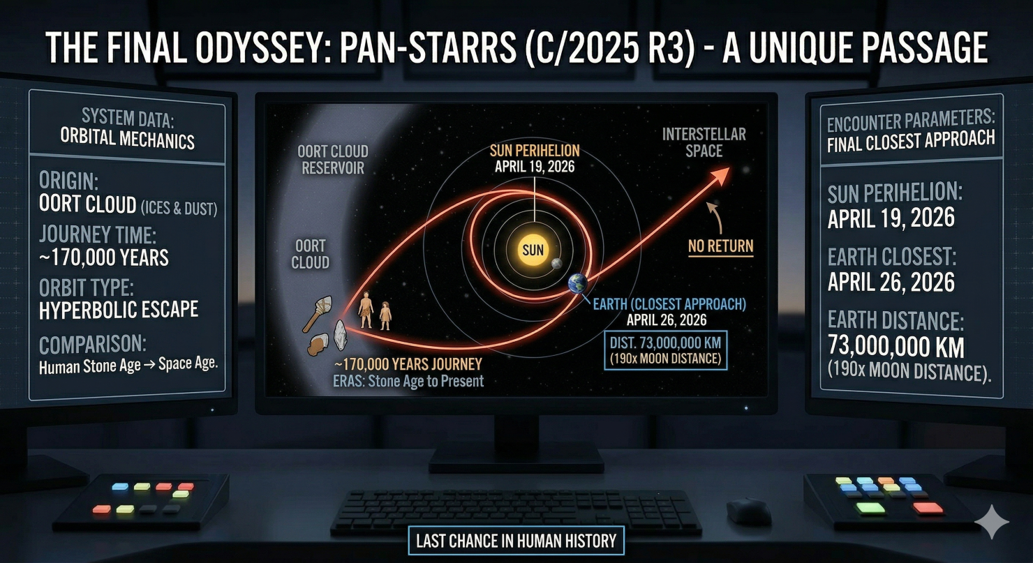 パンスターズ彗星(C/2025 R3)は、17万年という想像を絶する旅を経て私たちの前に現れた、宇宙の奇跡そのものです。太陽系の誕生当時の情報を今に伝えるタイムカプセルであり、今回を逃せば二度と出会うことのできない、永遠の別れを前提とした訪問者でもあります。