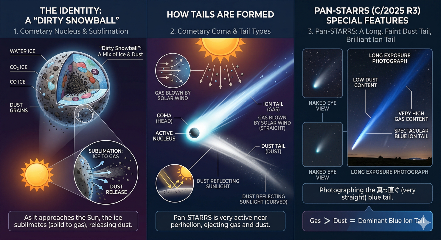 彗星の本体は、水や二酸化炭素、一酸化炭素などの氷に、塵(ダスト)が混ざったもので、「汚れた雪だるま」と例えられます。太陽に近づくと、その熱で氷が直接ガスになり、周囲に塵を撒き散らします。これが彗星の頭の部分である「コマ」や、長く伸びる「尾」の正体です。パンスターズ彗星は今、太陽の熱を最も強く受ける時期にあり、非常に活発にガスを噴き出しています。