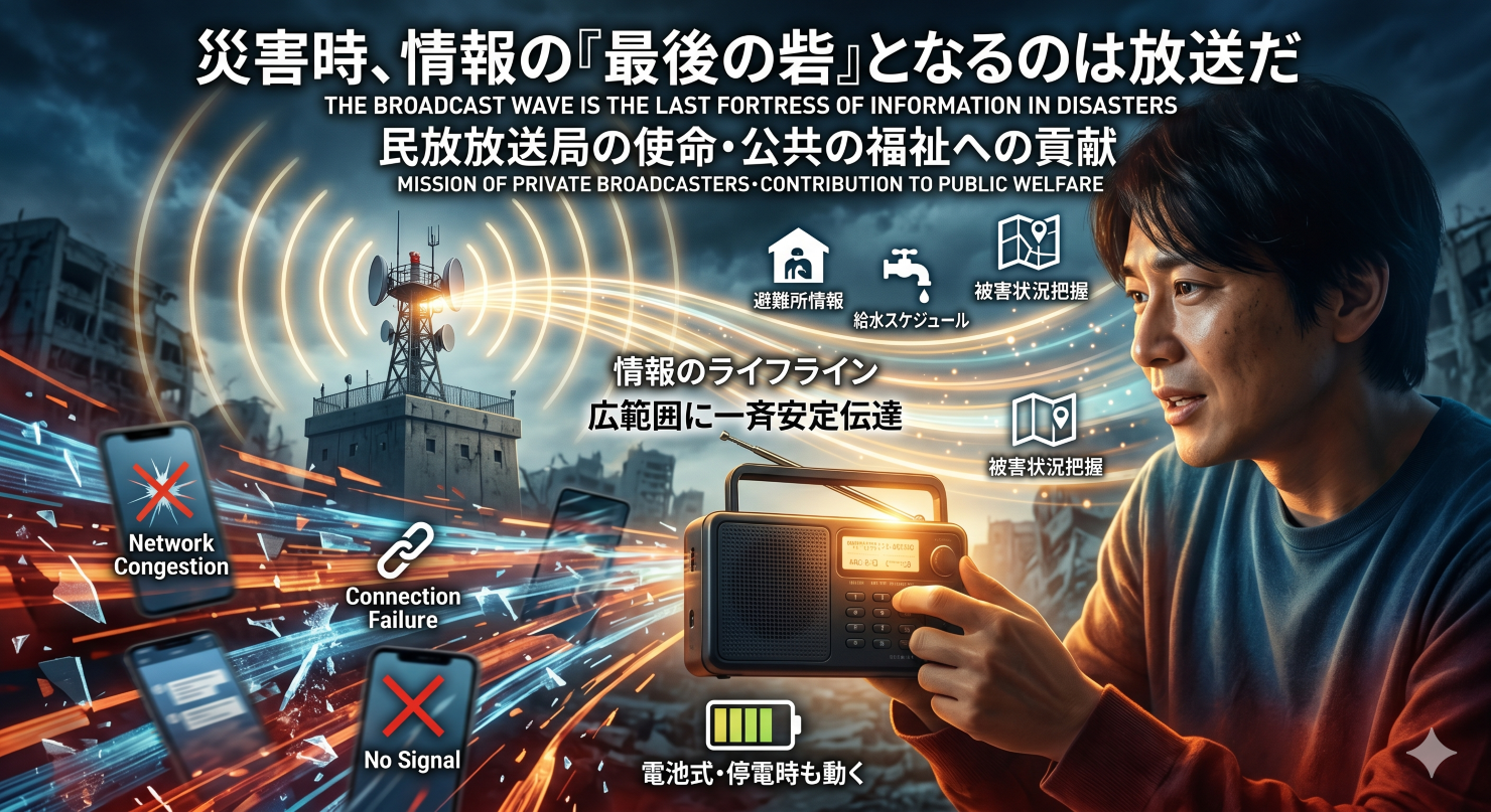 民放放送局が持つ最も重要な使命、それは「公共の福祉」への貢献、つまり災害時の情報発信です。地震や台風などの緊急事態が発生した際、インターネットは回線が混雑したり、基地局の障害で繋がりにくくなったりすることがあります。しかし、放送波は広範囲に一斉に届けることができるため、極めて安定した伝達手段となります。