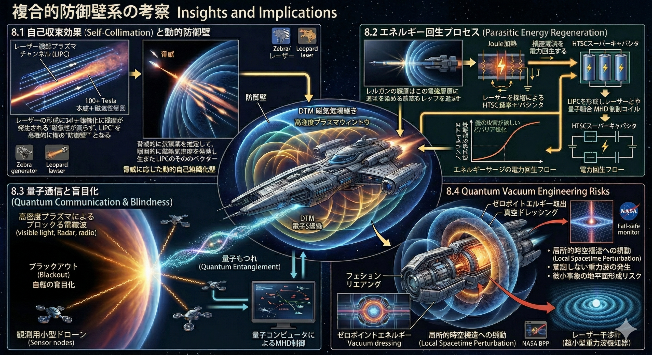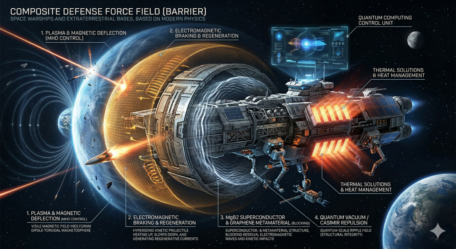 この記事で定義した宇宙艦船および地球外基地防衛用の「複合防御力場(バリア)」は、単一のSF的架空技術に依存するものではなく、プラズマ物理学、超伝導電磁気学、高出力マイクロ波工学、メタマテリアル設計、および量子真空制御といった、現在地球上で進行している複数の最先端物理学領域の統合によって実現される、極めて現実的かつ精緻なエンジニアリングの産物です。