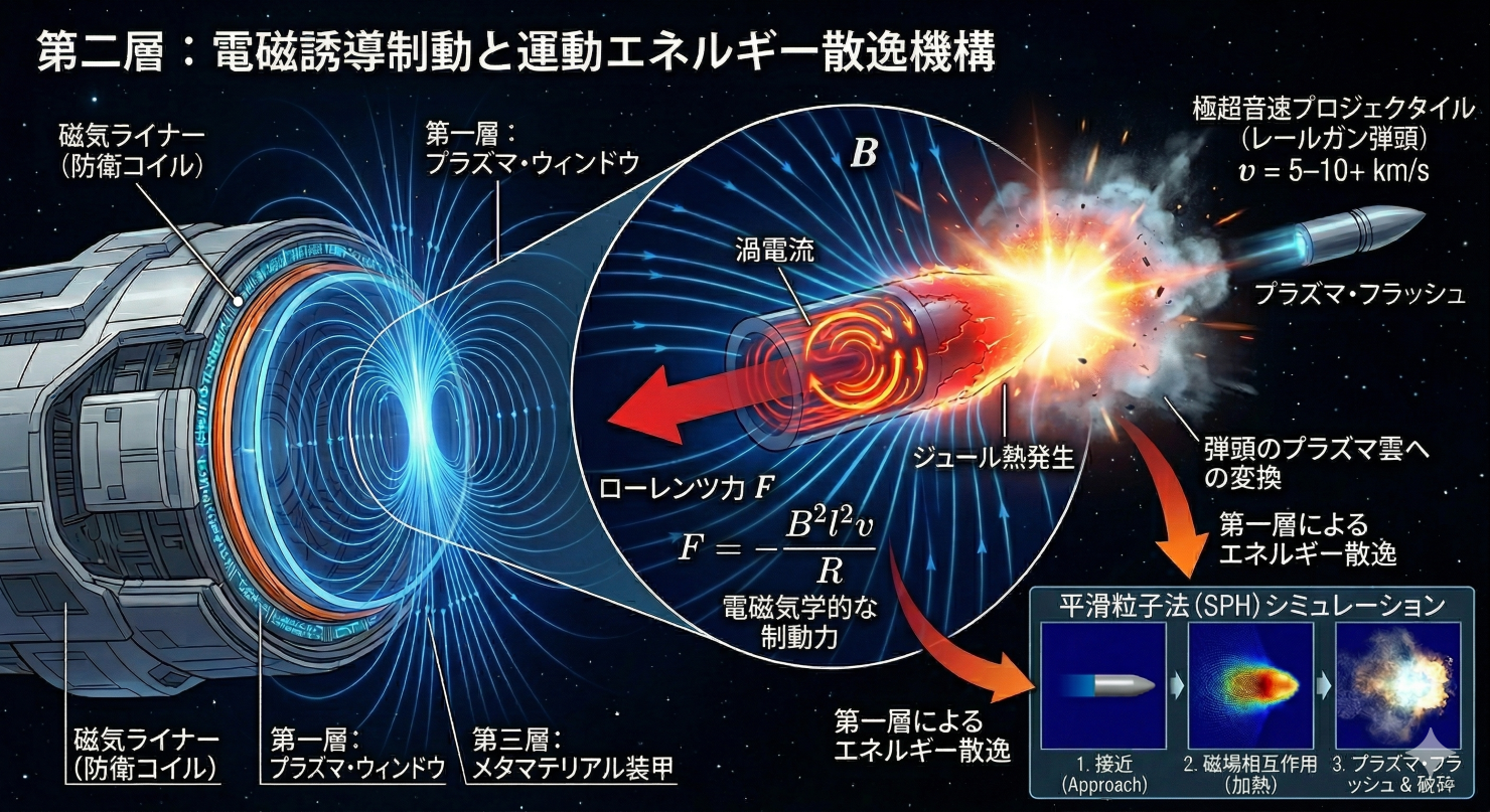 第一層のプラズマおよび磁気シールドは荷電粒子や電磁波に対して極めて有効ですが、質量を持たないエネルギー兵器とは異なり、レールガン(電磁投射砲)に代表される極超音速の質量兵器(速度 5 km/s から 10 km/s 以上)に対しては、プラズマ層だけでは物理的な貫通を完全に防ぐことは困難です。質量兵器に対しては、強力な磁場を用いた電磁気学的な制動(ブレーキ)が最も有効なマクロスケールの防衛手段となります。