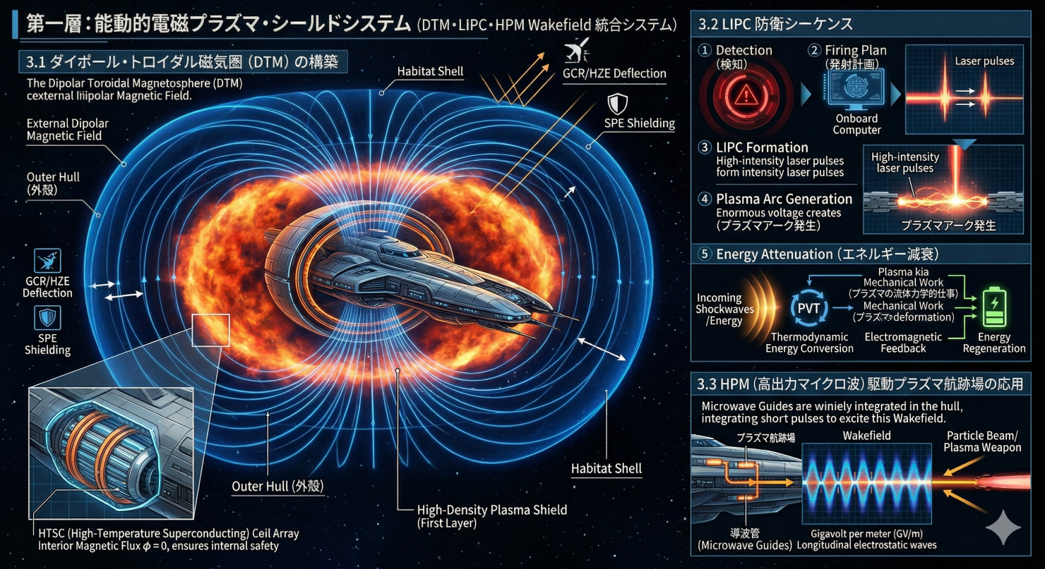 これは、システムが生成するダイポール・トロイダル磁気圏(DTM)が単に宇宙線を逸らす受動的な磁気シールドとして機能するだけでなく、プラズマ兵器や対爆発用プラズマ・ウィンドウを展開するための「不可視の導波管(ガイドレール)」として機能することを意味します。敵の攻撃ベクトルを検知した瞬間、システムはそのベクトル上の磁束密度を局所的に高め、そこにレーザーを照射することで、瞬時に極めて密度の高いプラズマの「防御の柱」をピンポイントで構築できます。つまり、バリアは常に全方位に最大出力で展開されてエネルギーを浪費する必要はなく、脅威の接近に伴ってその場に自己組織化する、極めて動的かつ省エネルギーな壁として振る舞うのです。