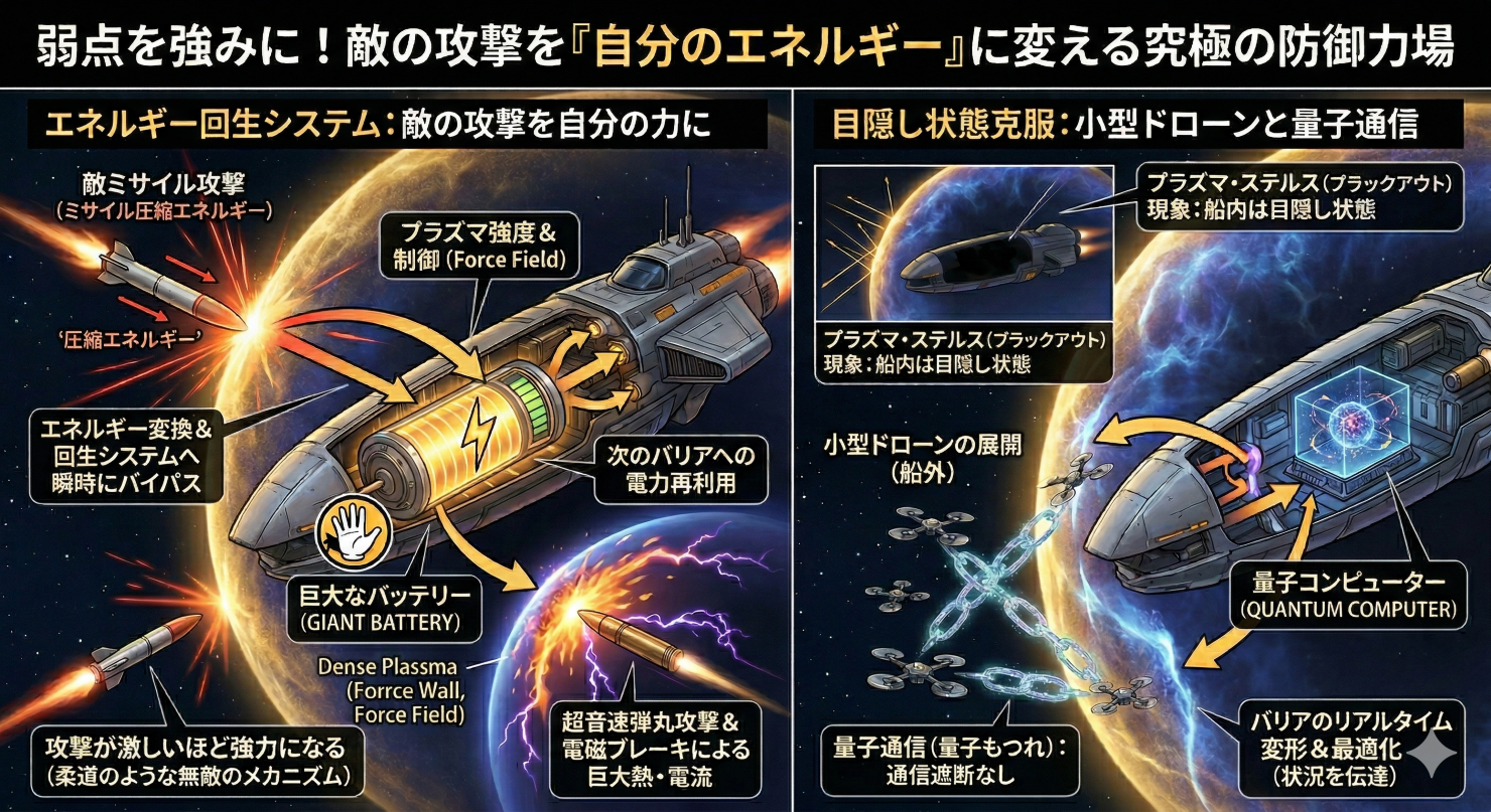 しかし、弱点もあります。強力なプラズマの壁に囲まれると、レーダーや光の電波まで遮断されてしまい、船の中から外の様子が一切見えなくなる「プラズマ・ステルス(ブラックアウト)現象」に陥ります。これを解決するため、船の外に無数の小型ドローンを飛ばし、絶対に通信が遮断されない「量子通信(量子もつれ)」を使って外部の状況を船内の量子コンピューターに伝達し、バリアの形をリアルタイムで変形させるという解決策が組み込まれています。