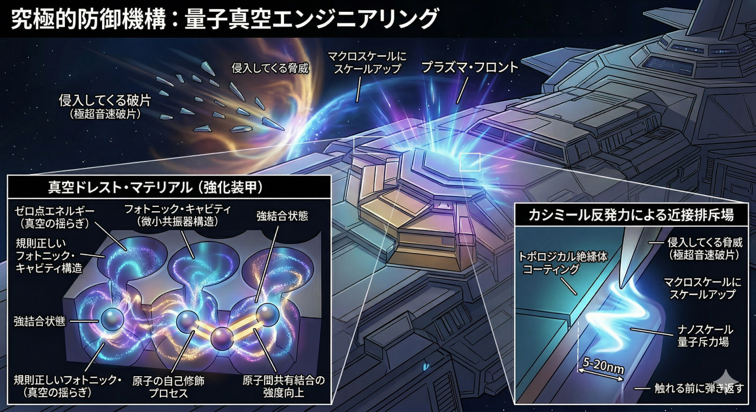 宇宙の「真空」は、実は何もない空っぽの空間ではなく、目に見えない莫大なエネルギー(ゼロ点エネルギー)が常に揺らぎ続けています。特殊な加工を施した装甲表面(真空ドレスト・マテリアル)は、この空間の揺らぎをコントロールし、原子同士の結びつきを人為的に強固にします。さらに、「カシミール反発力」と呼ばれるミクロの世界の力を応用することで、敵の破片が装甲に物理的に触れる数ナノメートル手前で、量子レベルの「反発力」を生み出し、弾き返すことができます。これぞまさに、究極の「触れられない力場(フォース・フィールド)」です。