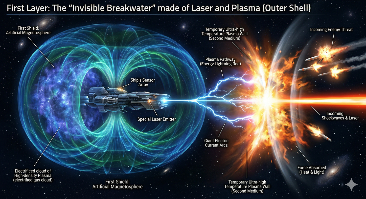 敵のミサイルの爆発による衝撃波や、強力なレーザー兵器が迫ってきたとき、船に設置された超高感度センサーがそれを瞬時に察知します。そして、脅威に向かって特殊なレーザーを発射し、空間に一瞬にして「プラズマの通り道」を作ります。そこに巨大な電流を流し込むことで、一時的な超高温のプラズマの壁(第二の媒質)が出現します。
