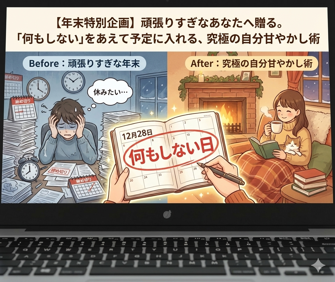 年末の数日間、あるいはたった1日だけでも構いません。「何もしない」という予定をスケジュール帳に書き込み、罪悪感なく自分を甘やかす方法をご提案します。