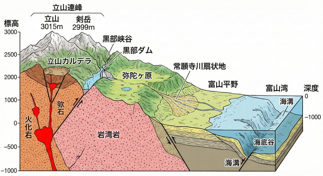 ※図:立山連峰から富山湾に至る富山県の地形断面図
