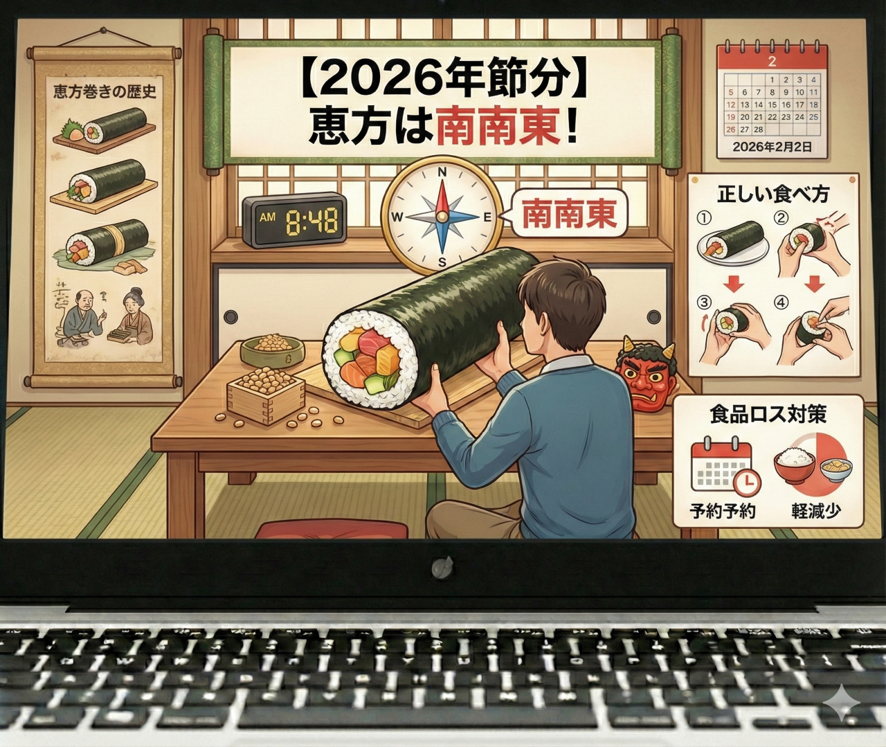 【2026年節分】恵方は南南東!恵方巻の歴史・正しい食べ方・食品ロス対策まで完全ガイド