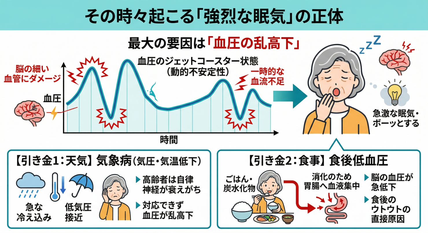 「毎日ではなく、時々強烈な眠気に襲われる」という場合、その日だけ発生する「引き金(トリガー)」が存在します。その最大の要因が「血圧の乱高下」です。