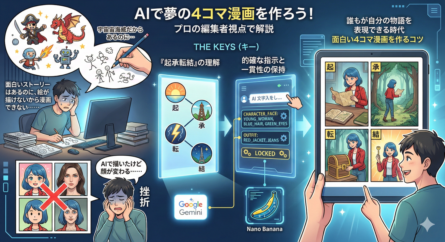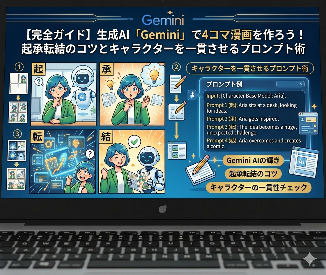 本記事では、プロの編集者視点で4コマ漫画の「面白さの構造」や「読みやすいコマ割り」を解き明かしつつ、Google Geminiと画像生成モデル「Nano Banana」を活用して、思い通りの漫画をスムーズに制作する実践的なテクニックを分かりやすく解説します。