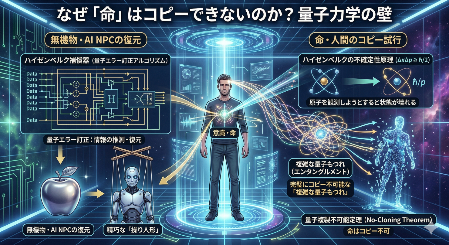 無機物やAIで動くNPCであれば、「量子エラー訂正アルゴリズム(ハイゼンベルク補償器)」を使って情報をある程度推測し、精巧な「操り人形」として復元できます。しかし、人間の意識や命というものは、完璧にコピーすることが原理的に不可能な「複雑な量子もつれ(エンタングルメント)」の上に成り立っています(量子複製不可能定理)。テクノロジーがどれほど進化しても、命だけはコピーできない。この事実は、非常に深く、宇宙の神秘を感じざるを得ません。