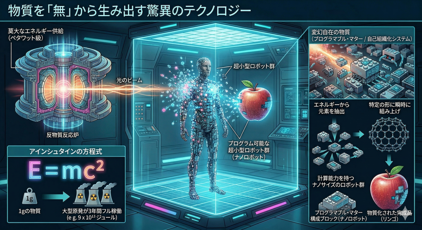 エネルギーから抽出された炭素などの元素は、「プログラマブル・マター(計算能力を持つナノサイズのロボット群)」によって、瞬時に特定の形に組み上げられます。目に見えない超小型のLEGOブロックが、空中で自動的に集まって人間やリンゴを形作る様子を想像してください。