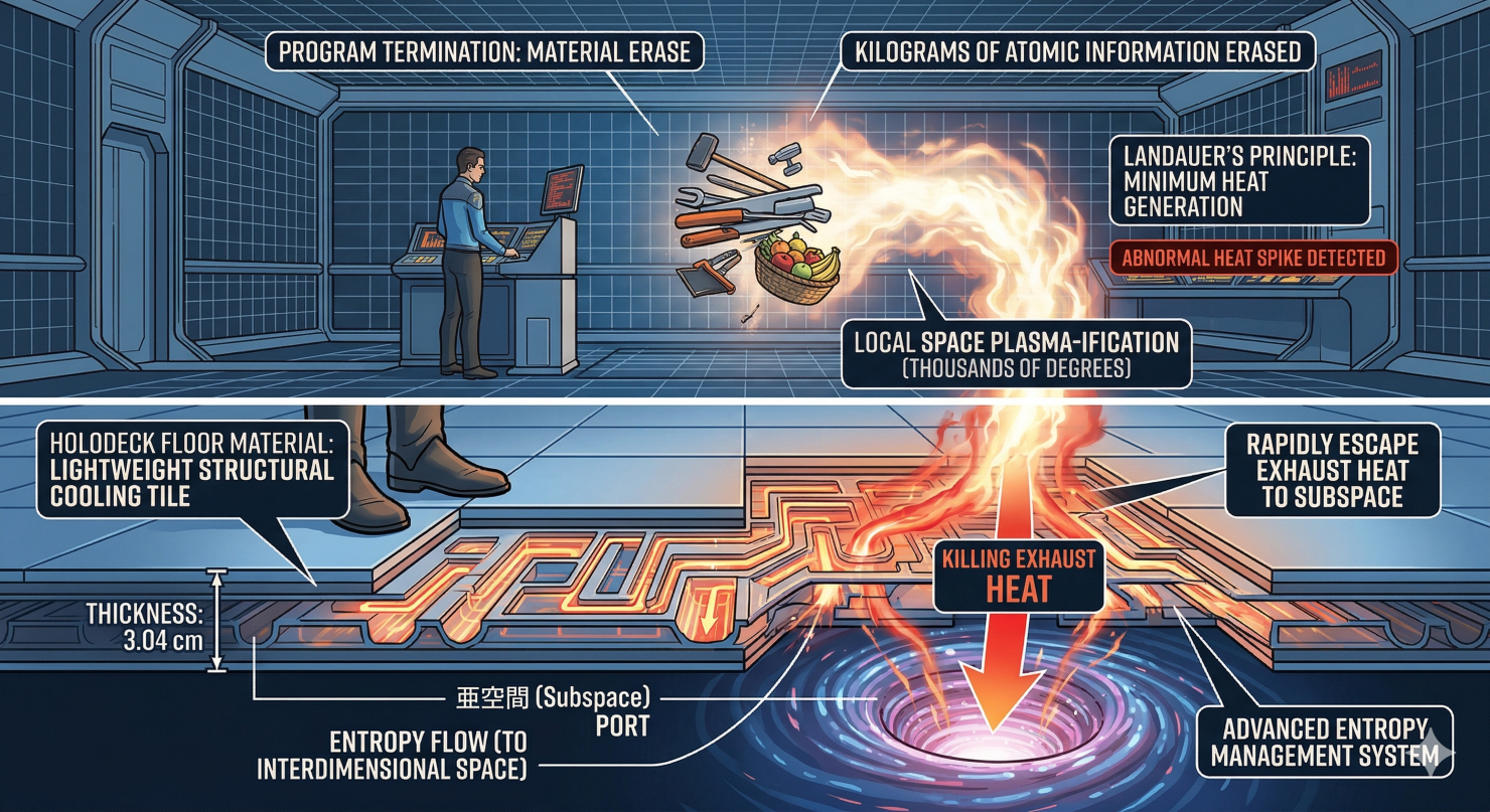 パソコンのデータを消すだけでも微小な熱が出ますが、ホロデッキのように「数キログラムの物理的な物質(莫大な原子の情報)」を一瞬で消去して無に帰す場合、その排熱は局所的な空間をプラズマ化(数千度)させるほど爆発的なものになります。