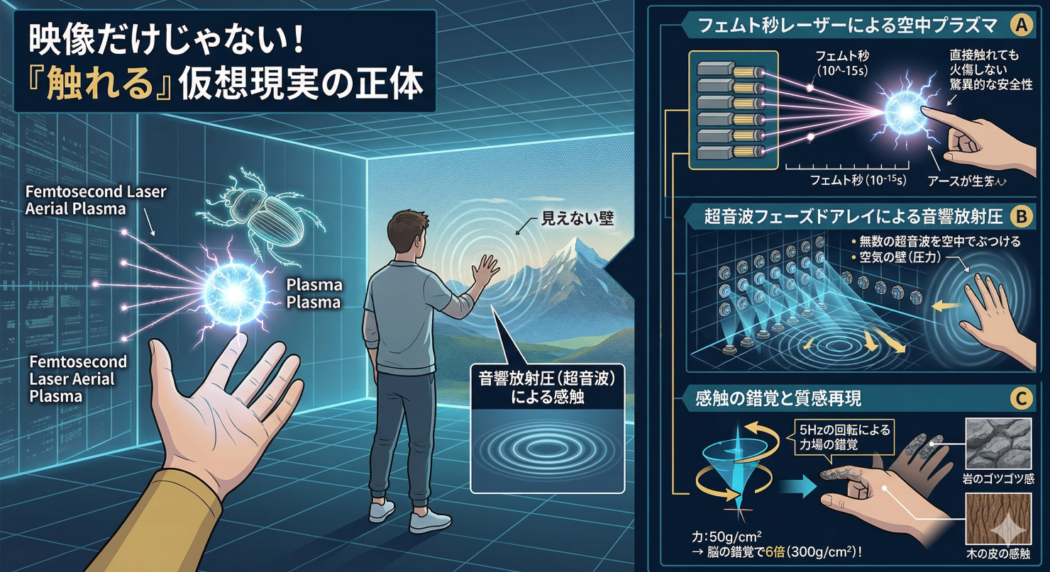 さらに興味深いデータがあります。そのままの超音波では「1平方センチあたり50グラム」程度の力しか出せませんが、この超音波の焦点を「1秒間に5回転(5Hz)」させることで、人間の脳はそれを6倍も強力な力として錯覚するのです。これにより、岩のゴツゴツ感や木の皮の感触まで、空中で完璧に再現可能になります。