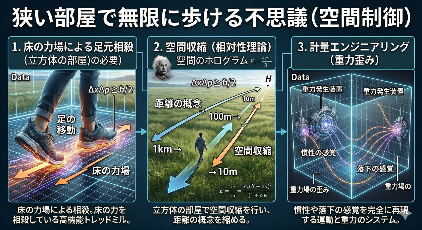 さらに、部屋の周囲の重力を局所的に歪める「計量エンジニアリング」を用いて、慣性や落下の感覚まで完全に再現します。もはや映像を見せているのではなく、部屋の中の物理法則そのものを書き換えていると言って良いでしょう。
