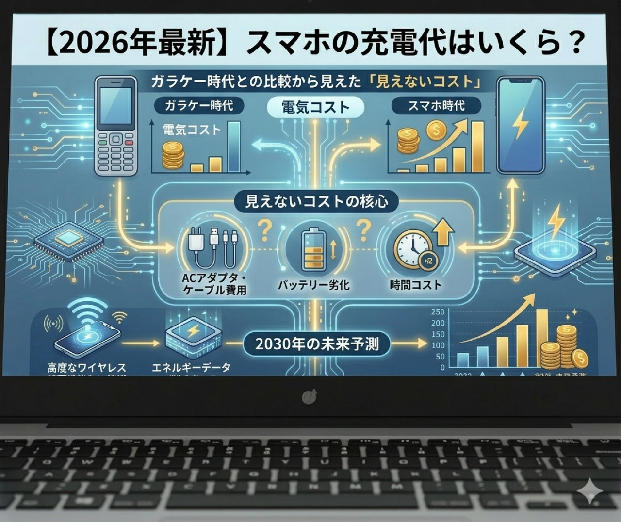 この記事では、ガラケー時代から現代に至るまでの「充電コスト」の歴史的な変化をひも解きながら、ウェアラブル端末が普及した現代の複雑な充電事情と、テクノロジーが私たちを充電のストレスから解放してくれる「2030年の未来予想図」をわかりやすく解説します。