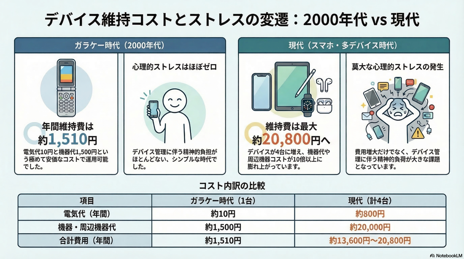 - 現代(スマホ・タブレット・ウェアラブル等 計4台):電気代 約800円 + 機器交換・周辺機器等 約20,000円 = 年間 約13,600円〜20,800円(+莫大な心理的ストレス)