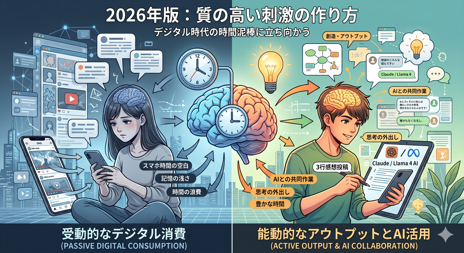 2026年現在、私たちの周りにはAIやSNS、動画配信サービスなど、手軽にインプットできる情報が溢れています。スマホを眺めているだけで数時間が過ぎてしまう、という経験は誰にでもあるはずです。しかし、こうした「受動的なデジタル消費」は、体感時間を最も短くさせる要因の一つです。