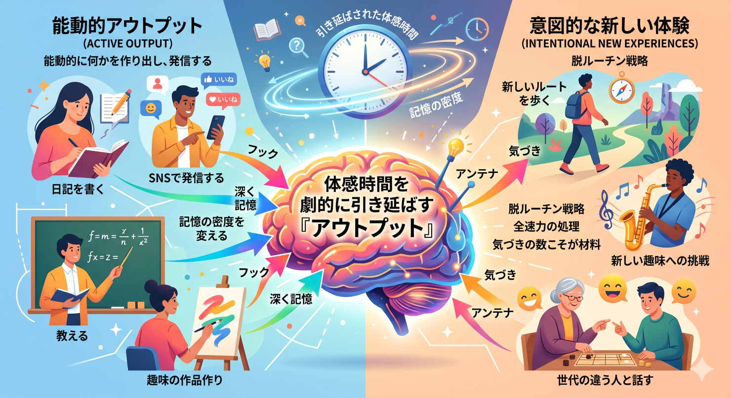 では、どうすればこの時間の加速を止めることができるのでしょうか。その答えこそが「アウトプット」と「新しい挑戦」です。受動的に情報を消費するだけの生活から、能動的に何かを作り出し、発信する生活へとシフトすることで、脳の時計をリセットすることができるのです。