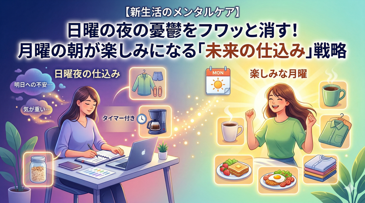 日本では「サザエさん症候群」とも呼ばれるこの憂鬱感。特に新生活が始まったばかりの4月は、緊張からくる疲労も相まって、日曜の夜がひどく重たく感じられるものです。今日は、そんなブルーな気持ちを和らげ、月曜日の朝を少しだけ前向きに迎えるための「未来への仕込み」をご紹介します。