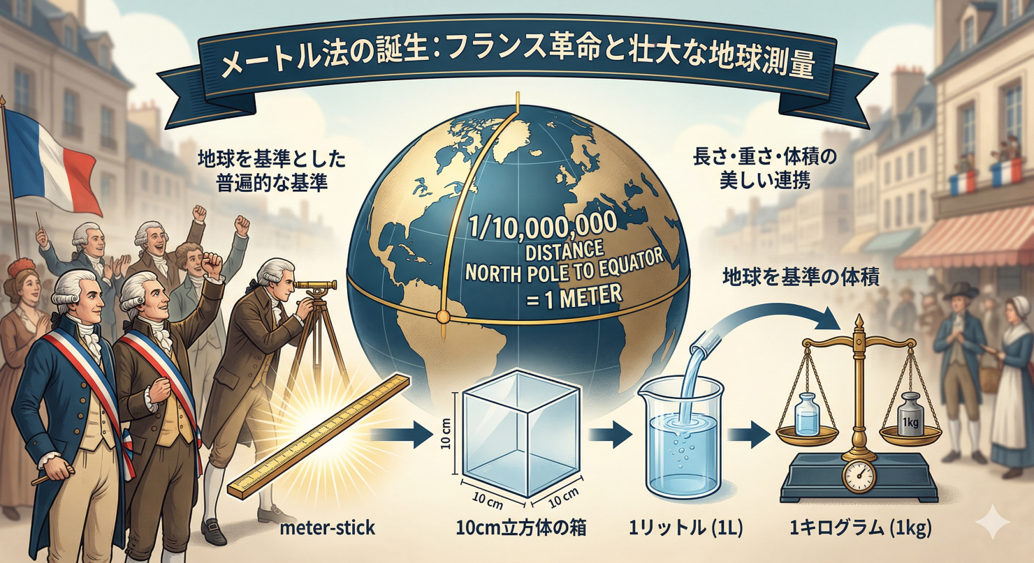 ちょうどその頃、フランス革命が起こり、社会の古い仕組みを根本から作り直そうという動きが活発になりました。そこで学者たちは「特定の国や王様の権力に左右されない、地球上の誰もが納得する普遍的な基準を作ろう」と立ち上がりました。そして、「地球の北極から赤道までの距離の1000万分の1」を、「1メートル」と定めることに決めたのです。