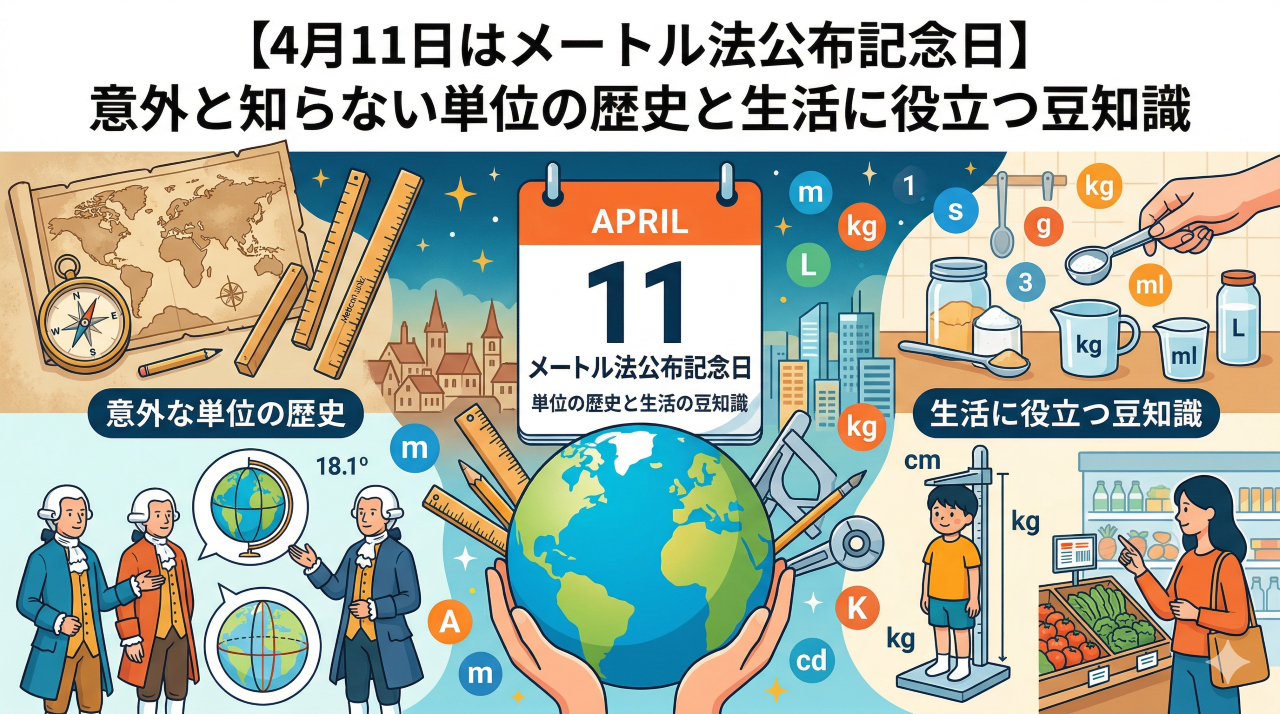 「1メートルってどうやって決まったの?」「なぜテレビのサイズはインチで呼ぶの?」と、ふとした瞬間に疑問に思ったことはありませんか?私たちの生活に欠かせない「長さ」や「重さ」のルールは、実はとても奥が深く、壮大な歴史のロマンが詰まっています。4月11日は、日本でメートル法が法律として定められた大切な記念日です。この記事では、単位の歴史的な成り立ちから、お料理やDIYなど日常で役立つ豆知識まで、専門用語を使わずに分かりやすく丁寧に解説します。