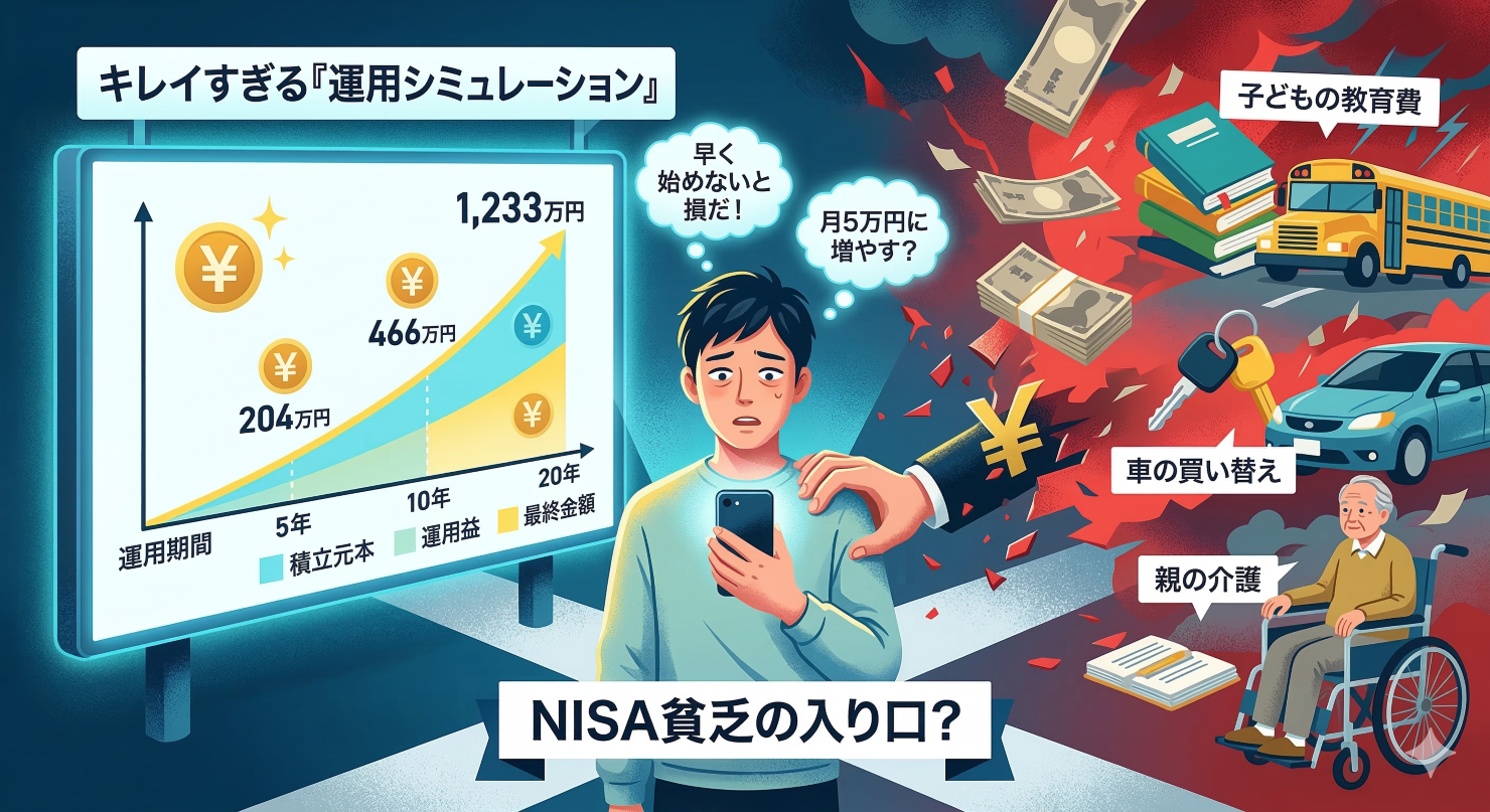 現実の人生では、子どもの教育費、車の買い替え、親の介護など、まとまった現金が必要になるイベントが山ほどあります。シミュレーションの「夢」に魅了され、足元の「赤字家計」から目を背けてしまうことが、NISA貧乏の入り口なのです。