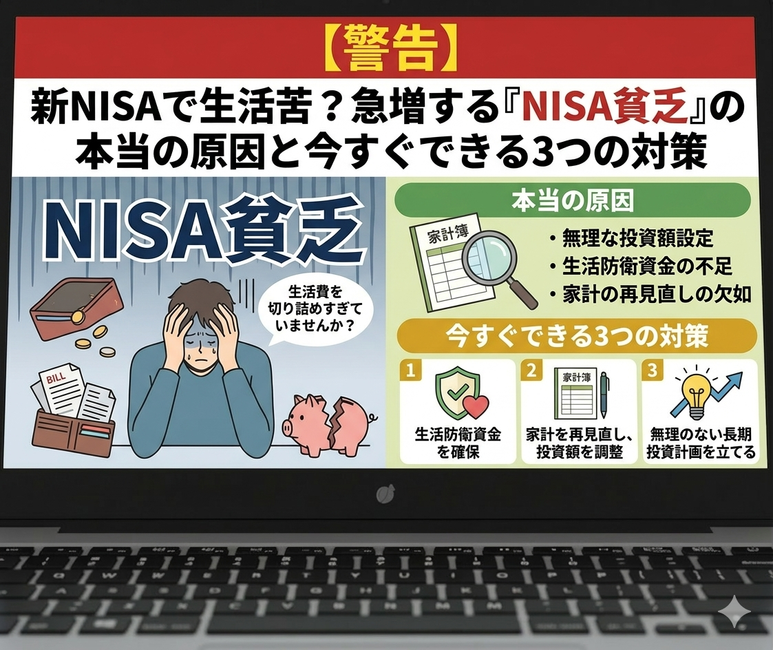「NISA貧乏」とは、将来の不安や「非課税枠を使い切らなきゃ!」という強迫観念から、自分の収入に見合わない過大な金額をNISAに注ぎ込み、日々の生活資金が底をついてしまう状態のことです。
