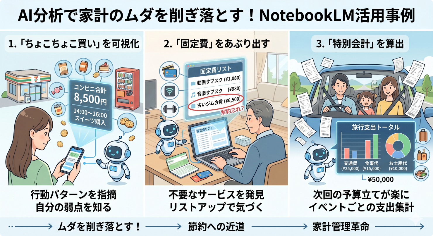 実際にNotebookLMを家計簿として使うと、どのような発見があるのでしょうか。具体的な活用シーンをいくつかご紹介します。