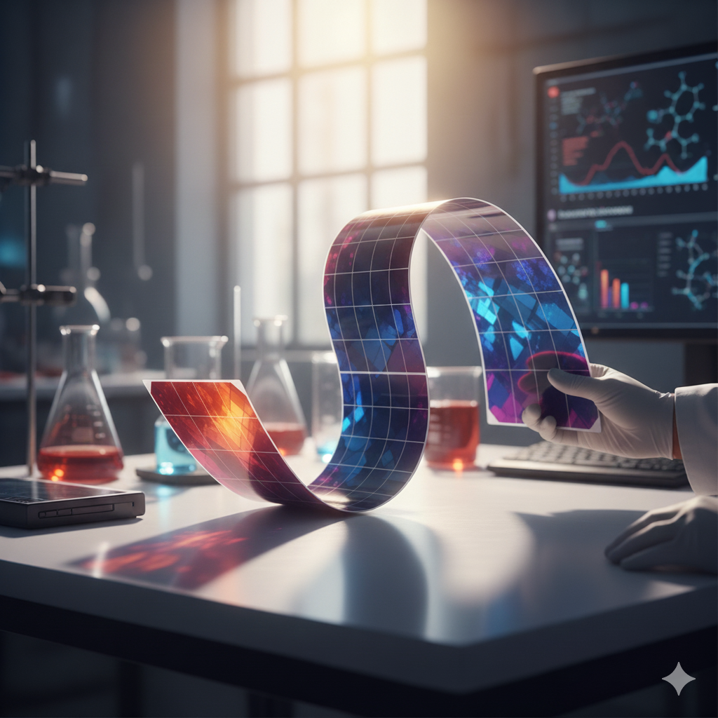 従来のシリコン系太陽電池に匹敵する高い発電効率を持ちながら、**薄く、軽く、曲げられる(フレキシブル)**という革新的な特徴を持っています。