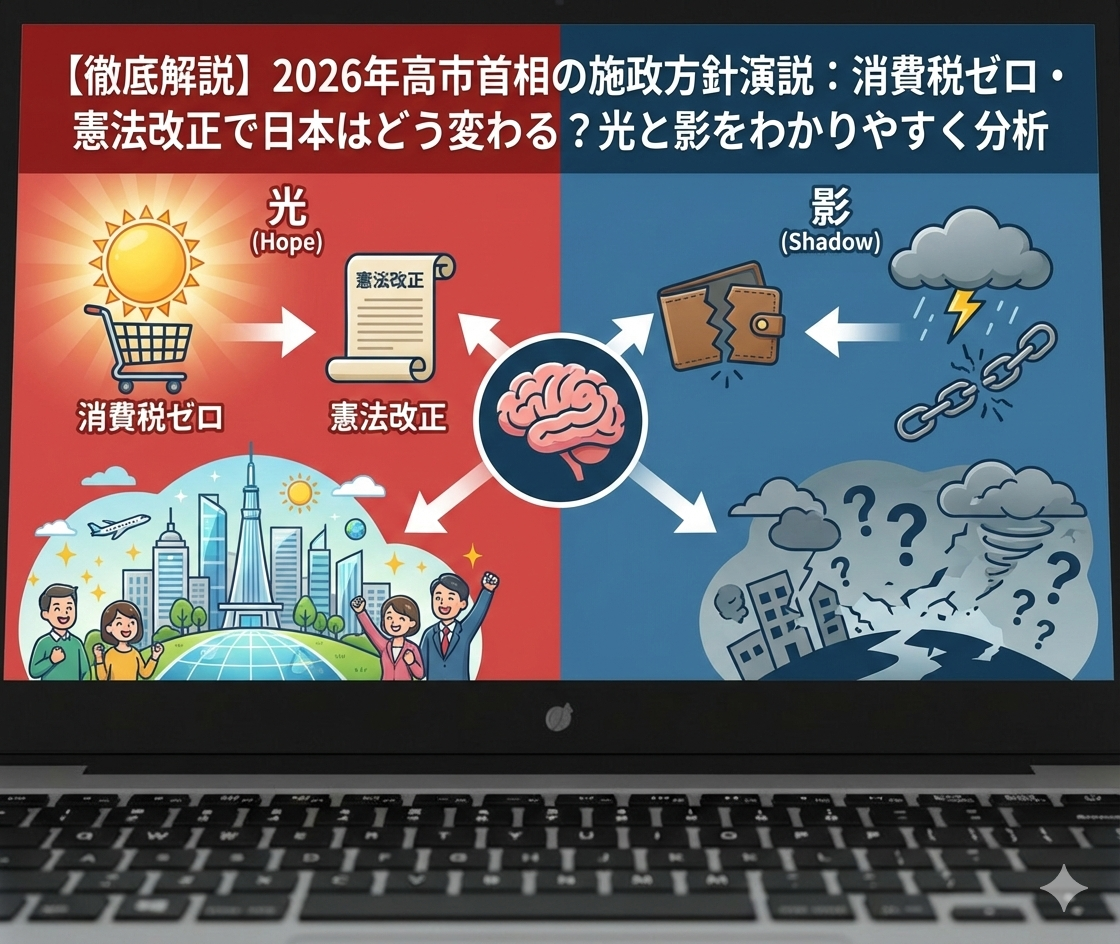 この記事では、専門用語が多くて分かりにくい施政方針演説の内容を、データや本質的な意味はそのままに、読みやすさを意識して徹底解説します。日本がこれから向かう「輝かしい未来像」と、その裏に潜む「恐ろしいリスク」の両方を理解していきましょう。