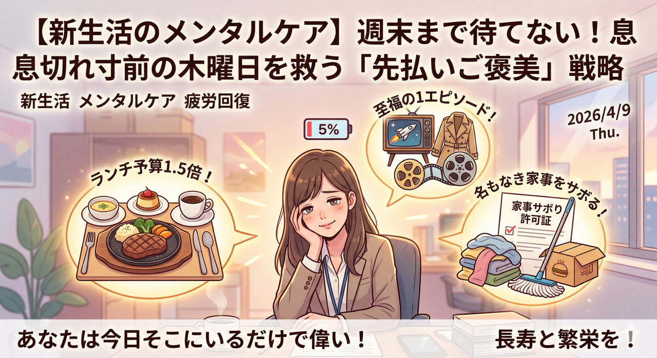 実は、心理的に一番しんどいのは「水曜日」ですが、肉体的な疲労がピークに達するのは「木曜日」だと言われています。月・火・水と無意識に使っていた緊張感(アドレナリン)が切れ、心身のバッテリーが残り5%になっている状態です。今日は、そんなガス欠寸前の木曜日を生き抜くための「先払いご褒美戦略」をお届けします。