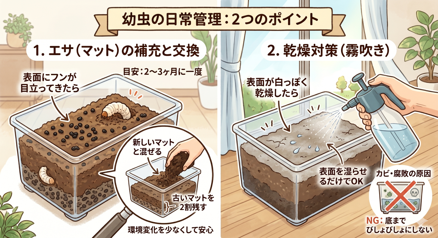 古いマットやフンを放置しすぎると、雑菌が繁殖しやすくなります。幼虫の体が黒ずんでくる病気(黒点病など)を防ぐためにも、適度な清掃と新しいマットへの更新を心がけてください。