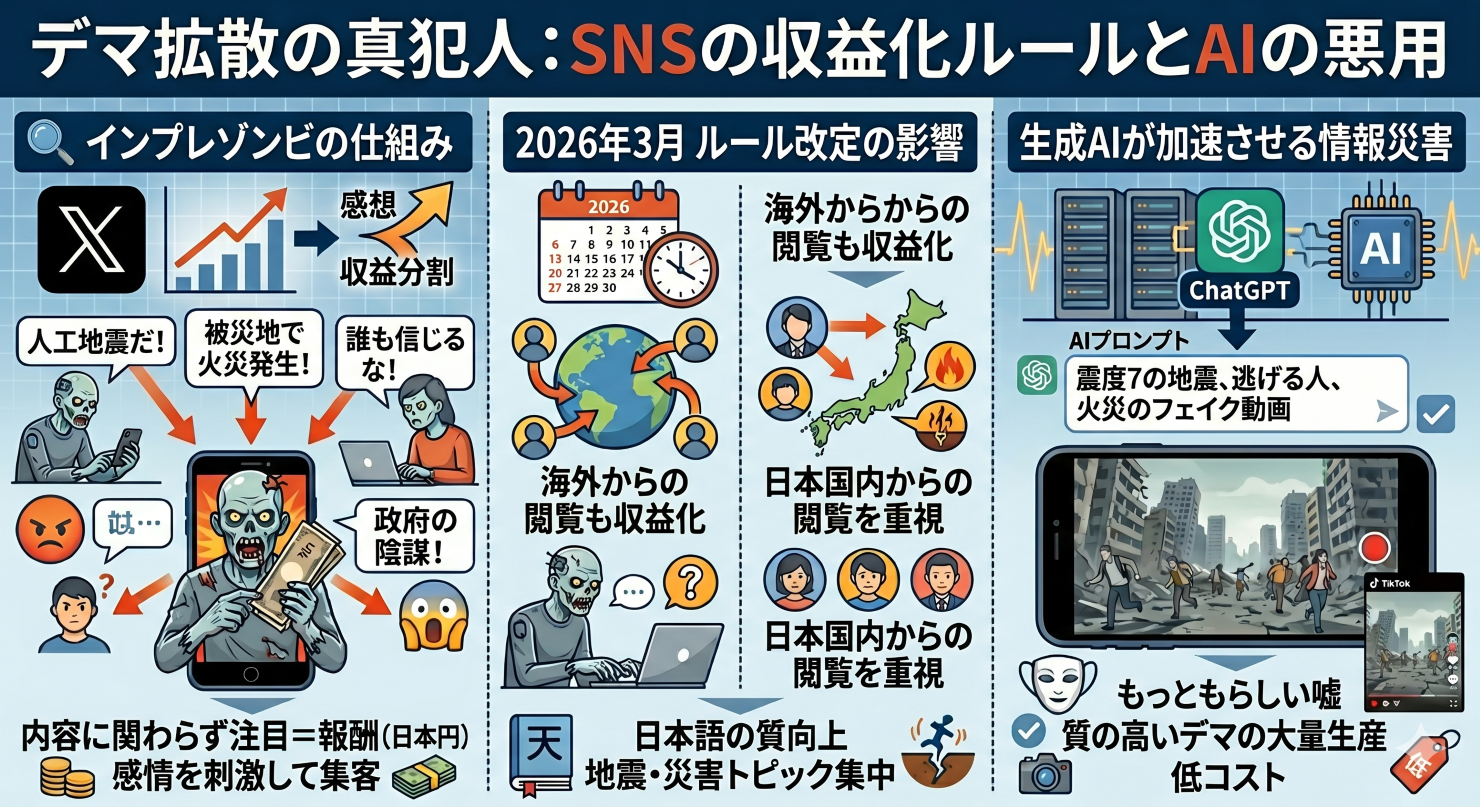 実は、今回のデマ拡散には特定の背景があります。地震の約1ヶ月前、2026年3月にXの収益化ルールが大きく変わりました。それまでは海外からの閲覧でも収益になっていましたが、新しいルールでは「日本国内からの閲覧」がより重視されるようになったのです。これにより、インプレゾンビたちは日本のユーザーの関心を引くために、より自然な日本語を使い、日本人が最も気にする「地震」や「災害」のトピックを重点的に狙うようになりました。