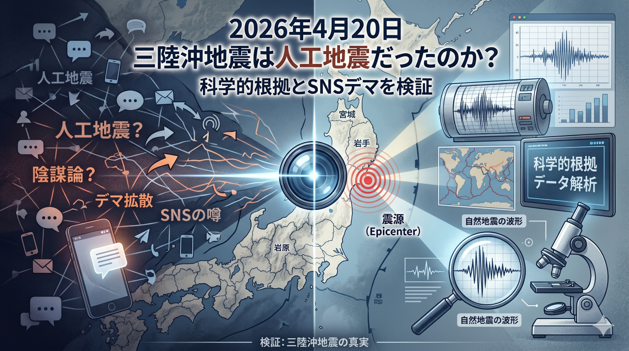 大きな地震が発生した直後、スマートフォンの画面に飛び込んでくる「これは人工地震だ」「予言されていた通りだ」といった刺激的な言葉に、不安を煽られた経験はないでしょうか。令和8年(2026年)4月20日、三陸沖を震源とする大規模な地震が発生した際も、SNS上では驚くほどの速さでこうした「人工地震説」が拡散されました。