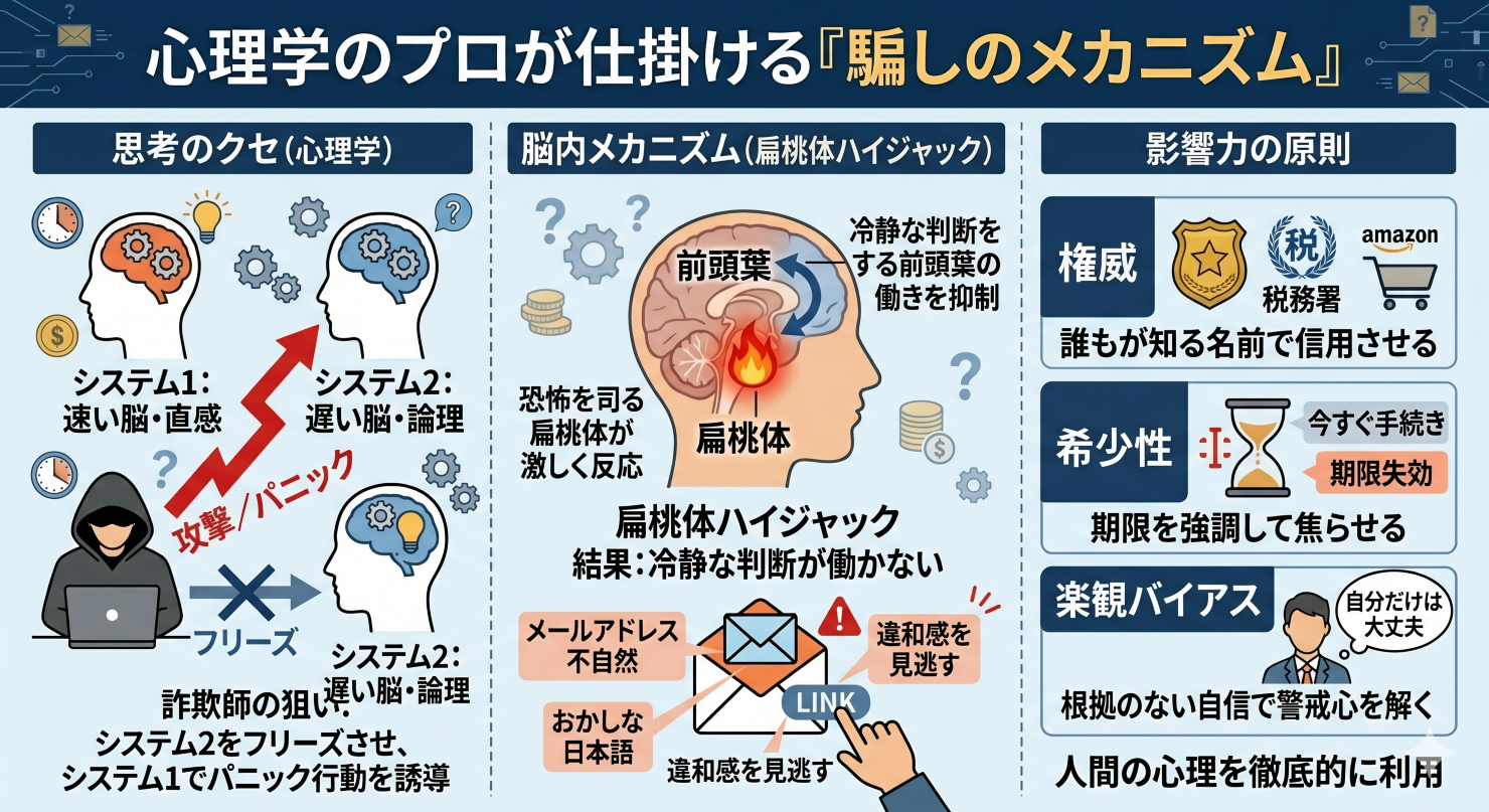 例えば、「24時間以内に確認しないとアカウントを削除します」というメールが届いたとき、私たちの脳内では恐怖を司る「扁桃体(へんとうたい)」という部分が激しく反応します。これを「扁桃体ハイジャック」と呼びます。こうなると、冷静な判断ができるはずの前頭葉が働かなくなり、普段なら気づくはずの「メールアドレスの不自然さ」や「おかしな日本語」を見逃して、リンクをタップしてしまうのです。