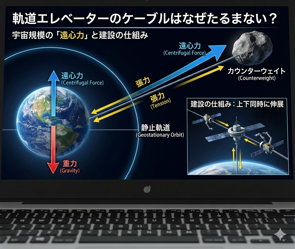 軌道エレベーターのケーブルはなぜたるまない?宇宙規模の「遠心力」と建設の仕組み