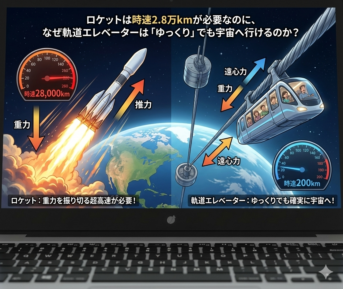 ロケットは時速2.8万kmが必要なのに、なぜ軌道エレベーターは「ゆっくり」でも宇宙へ行けるのか?