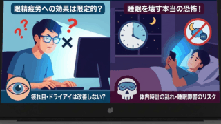 【2025年最新医学】ブルーライトカット眼鏡は「意味がない」?眼精疲労への真の効果と、睡眠を壊す本当の恐怖ブルーライトカットの効果に関する医学的見解の概要 パソコンやスマートフォンの普及に伴い、「目を守る必需品」として定着したブルーライトカ...
