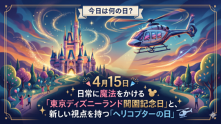 How To 今日は何の日?日常に魔法をかける「東京ディズニーランド開園記念日」と、新しい視点を持つ「ヘリコプターの日」 【4月15日は何の日?】日常に魔法をかける「東京ディズニーランド開園記念日」と、新しい視点を持つ「ヘリコプターの日」新年度が始まって3週目。一週間の折り返し地点にやってきましたね。本日は2026年4月15日(水曜日)です。本日の六曜は大安(... 2026.04.15 How Toお悩み元気・やる気が出るお話生活社会