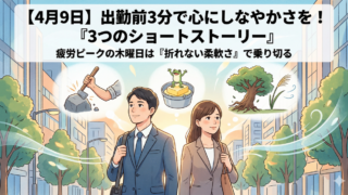 How To 【4月9日】新年度・第2週目の木曜日に!出勤前の3分で心が折れなくなる「3つのショートストーリー」 概要:疲労がピークの木曜日は「しなやかさ」で乗り切る「毎日頑張っているのに、ちっとも仕事ができるようになっている気がしない」「新しい職場のルールや空気に息苦しさを感じる」「週末まであと少しなのに、体力が持ちそうにない」。4月9日、第2週目の... 2026.04.09 How Toお悩み元気・やる気が出るお話生活社会