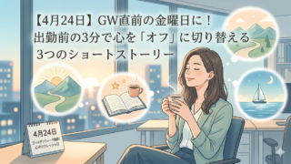 How To 【4月24日】GW直前の金曜日に!出勤前の3分で心を「オフ」に切り替える3つのショートストーリー 概要:1ヶ月を走り抜けたあなたへ。連休前の「最後のひと踏ん張り」と「手放す勇気」「今日を乗り切ればゴールデンウィークだけれど、もう体力が残っていない」「この1ヶ月、できない自分に直面してばかりで自信をなくしている」「仕事の不安を、せっかくの... 2026.04.24 How Toお悩み元気・やる気が出るお話生活社会