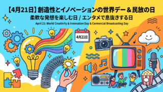 How To 今日は何の日?4月21日は柔軟な発想を楽しむ「創造性とイノベーションの世界デー」と、エンタメで息抜きする「民放の日」 【4月21日は何の日?】柔軟な発想を楽しむ「創造性とイノベーションの世界デー」と、エンタメで息抜きする「民放の日」新年度4週目の火曜日、本格的に今週の業務や授業が動き出している頃でしょうか。本日は2026年4月21日(火曜日)です。本日の六... 2026.04.21 How Toお悩み元気・やる気が出るお話生活社会