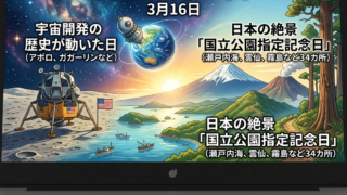How To 今日は何の日?宇宙開発の歴史が動いた日と、日本の絶景「国立公園指定記念日」 【3月16日は何の日?】宇宙開発の歴史が動いた日と、日本の絶景「国立公園指定記念日」新しい一週間が始まりました!本日は2026年3月16日(月曜日)です。本日の六曜は仏滅(ぶつめつ)。「物が滅する日」という字面から敬遠されがちですが、実は「... 2026.03.16 How Toお悩み元気・やる気が出るお話生活社会